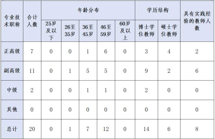 现有专任教师20人,兼职教师4人,校外实践导师2人,目前研究生每届8人,能够完全满足培养点课程教学、论文指导以及实践训练的要求。同时,专任师资队伍年龄梯队可持续,都是研究生学历,学缘多元融国际,职称分层协同。